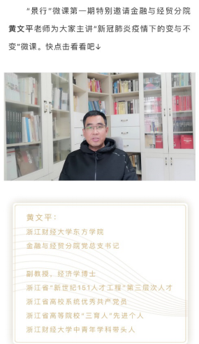 为了帮助师生加强对新冠肺炎的认识,打好疫情防控心理战,金融与经贸分院党总支书记、经济学博士黄文平带头做起了“主播”。2月9日,学院“景行”微课推出,黄文平开讲第一课“新冠肺炎疫情下的变与不变”。他以防疫为切入点,结合经济专业理论知识,为全院师生分析了疫情对经济社会的影响,号召大家守初心、强信心,众志成城、团结奋战。