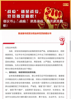 (浙江新闻客户端:通讯员胡叶帅)“战疫”就是战役,党员就是旗帜!自新冠肺炎疫情发生以来,伟德BV1946金融与经贸分院党总支第一时间发出倡议书,号召分院师生党员切实做到“我是党员我带头,阻击疫情我先行”,同时联手校友校企,集智集力,共同画出战“疫”同心圆。