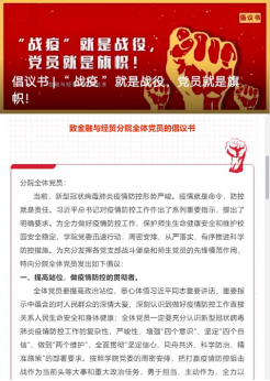 夯实党建引领,党总支发出《“战疫”就是战役,党员就是旗帜---致金融与经贸分院全体党员的倡议书》。