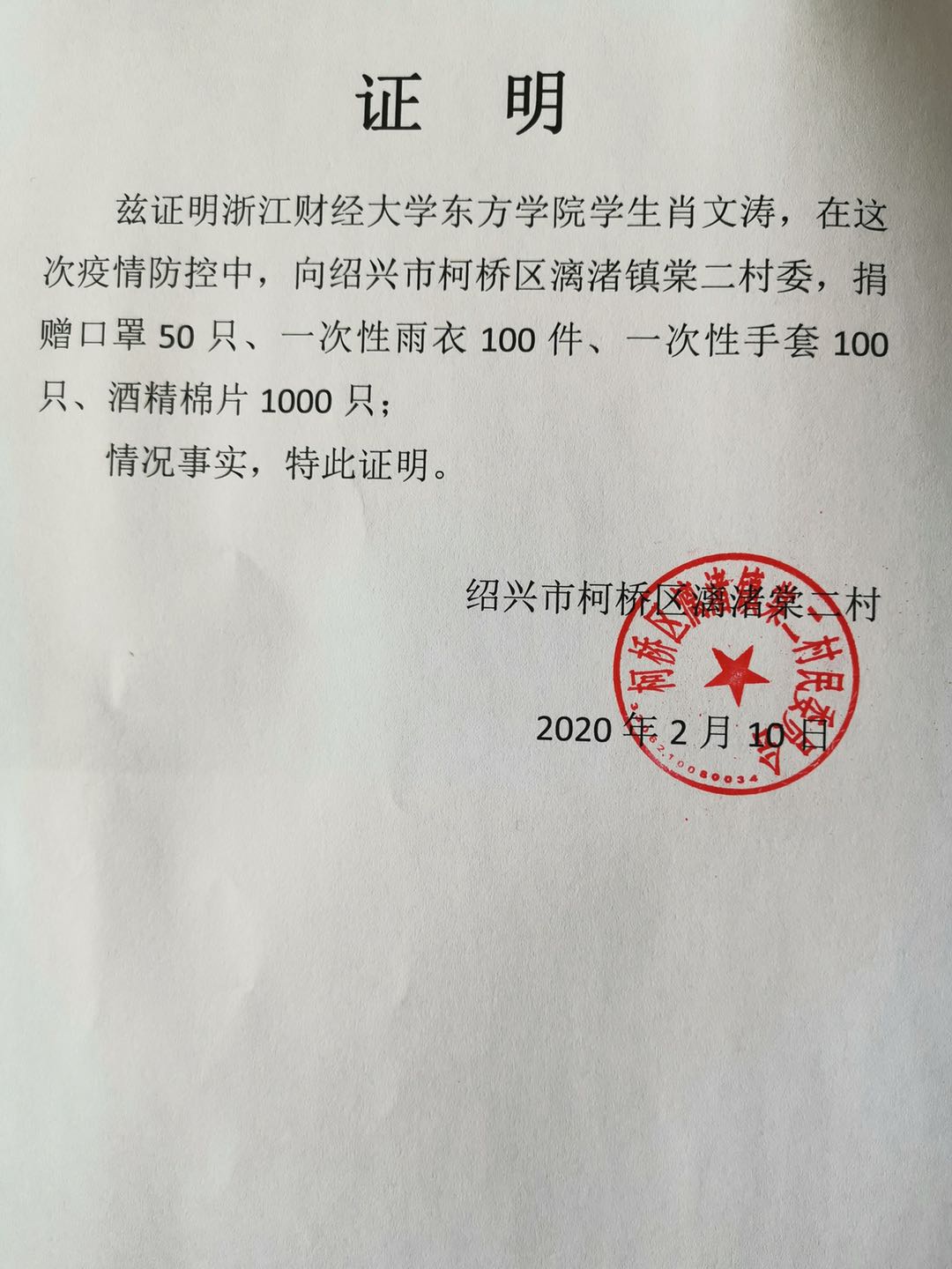 寒假期间,抗击疫情像一场没有硝烟的战争在中华大地打响。分院2018级国贸1班肖文涛在绍兴市柯桥区漓渚镇棠二村村委的号召下,自愿报名加入抗击疫情志愿服务队,经村委统一安排,他主要负责进村车辆及人员的安检工作。他按时到岗、为人友善,一丝不苟的工作态度和吃苦耐劳的工作精神得到了村民们和领导们的一致赞许。