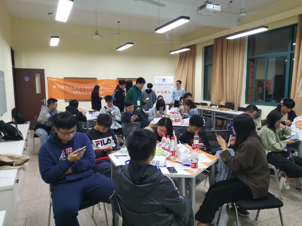 随后高顿代表老师介绍了一些课程安排、要求和职业规划等等。上届CFA人才培养项目奖学金获得者侯景域同学进行了相关学习经验分享,激励在场学弟学妹们要树立信心,以端正的学习态度和饱满的学习热情投入到CFA学习中,要耐得住寂寞。仪式最后,学员们进行了破冰活动——金融抗压赛,选举了班级班长——洪骏。