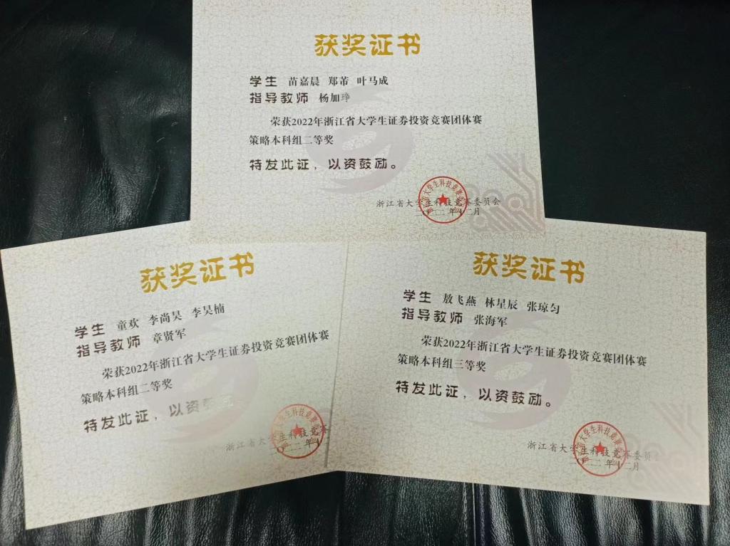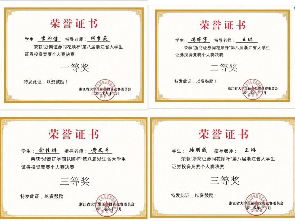 近日,由浙江省大学生科技竞赛委员会主办,浙江财经大学、浙江省大学生证券投资竞赛委员会承办的省级A类竞赛浙商证券同花顺杯第八届浙江省大学生证券投资竞赛落下帷幕。伟德国际victor·1946源自学子再创佳绩,共获个人赛一等奖1项、二等奖1项、三等奖2项;团队赛二等奖2项,三等奖1项。
