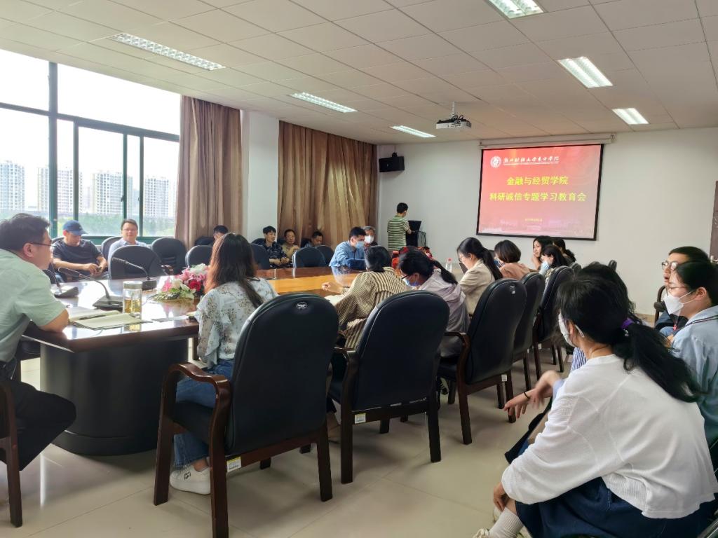 会上,老师们学习了中共中央办公厅《关于进一步加强科研诚信建设的若干意见》和《关于进一步弘扬科学家精神加强作风和学风建设的意见》等文件精神,金融与经贸院长李忠老师重点强调了有关科研诚信六个方面的内容。