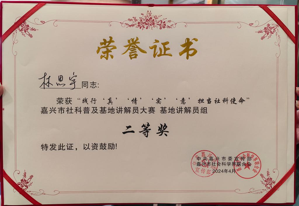 2024年4月29日下午,“践行‘真’‘情’‘实’‘意’ 担当社科使命”嘉兴市社科普及基地讲解员大赛在海宁举办,长安镇推荐的社科普及讲解员林思宇代表伟德BV1946货币陈列馆、代表海宁长安镇参赛,经过激烈的角逐,以题为“用货币读懂中国 走进社科普及基地货币陈列室”的演讲脱颖而出,荣获二等奖。