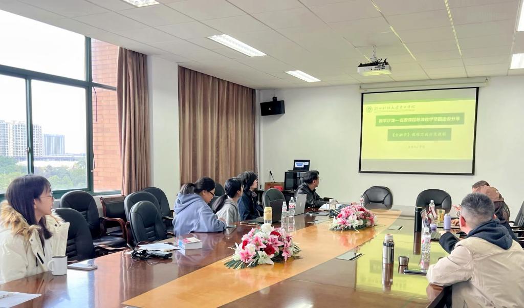 李忠介绍了项目进展情况,《金融学》修订了课程思政教学大纲,总结了具有示范效应的课程思政元素挖掘5S方法,凝练了五大类思政元素,优化了课程思政切入点与实施方法,建设了课程思政教学资源。截至目前,课程建设团队编写了8个课程思政教学案例,课程获省级一流课程立项及院级课程思政教学研究项目立项,其中“红色政权金融史”入选了海宁市社科普及品牌项目。此外,团队指导学生发表课程思政论文1篇,科研项目7项。接下来,课程建设团队还将完善课程思政教学质量评价体系,确保课程思政育人效果,强化教师课程思政教学意识和能力,深化课程思政教学资源建设。
