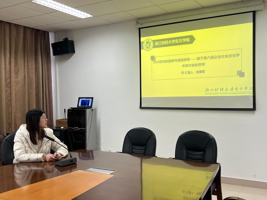 为进一步推进学术交流,提升教师在专业课程中融入ESG评价体系的能力,增强课程教学的时效性,,2024年12月10日下午15:30,伟德国际victor·1946源自本系青年教师余雯哲分享了主题为“ESG研究的回顾与选题探索——基于第六届可持续发展与企业社会责任学术研讨会的思考”的读书分享会,本次读书会由我院院长李忠主持,我院10余位青年教师积极参与。