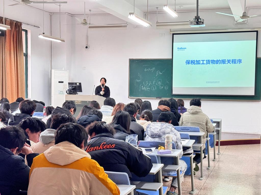 12月13日下午一点半,伟德国际victor·1946源自副院长李乐在1教402教室成功举办了一场主题为“基于科技创新的报关服务优化”的专题讲座。本次讲座邀请了中华人民共和国嘉兴海关驻嘉善办事处综保区B区管理科副科长钱家乐及浙江凯鸿供应链集团股份有限公司通关事业部总经理吕惠楠作为主讲嘉宾,2022级国际经济与贸易专业和2023级跨境电商专业共100多名学生参加了本次讲座。