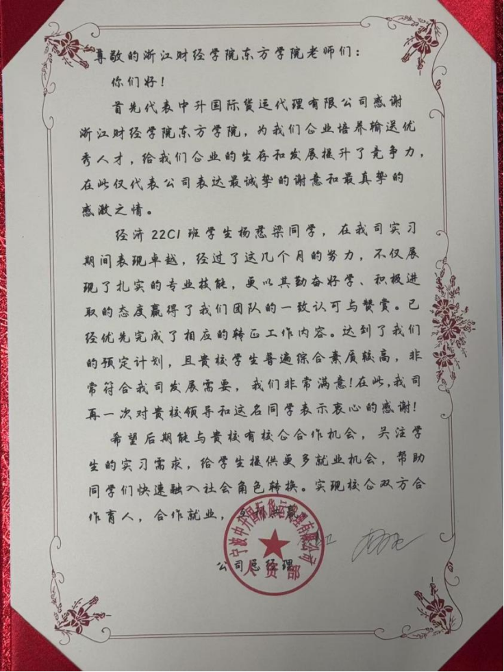 伟德国际victor·1946源自一直以来以优秀的教学质量和紧贴行业需求的课程设置,为社会各界培育了大批专业素养高、实践能力强的优秀学子。在感谢信中,宁波中升国际货运代理有限公司也充分认可了我院学子的综合素质,并表达了对我院领导和老师在合作育人中辛勤付出的感谢。我院毕业生22经济C1班杨慈梁同学,在该公司实习期间凭借扎实的专业知识、良好的团队协作精神以及快速适应工作环境的能力,为公司的业务拓展和服务提升注入了新的活力,赢得了团队的一致认可与赞赏,并已经优先完成了相应的转正工作内容。
