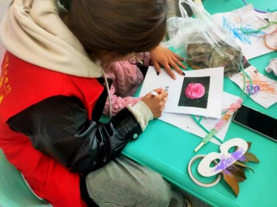 活动伊始,志愿者们为孩子们分发了树叶、松果、扭扭棒等自然材料,引导他们发挥想象力创作心中的自然世界。有的孩子将树叶拼贴成小动物的毛发,有的用扭扭棒为松果装上“触角”和眼睛,制作出独一无二的手工作品。每完成一件作品,志愿者们都会送上鼓励和奖励,孩子们的脸上洋溢着成就感的笑容。