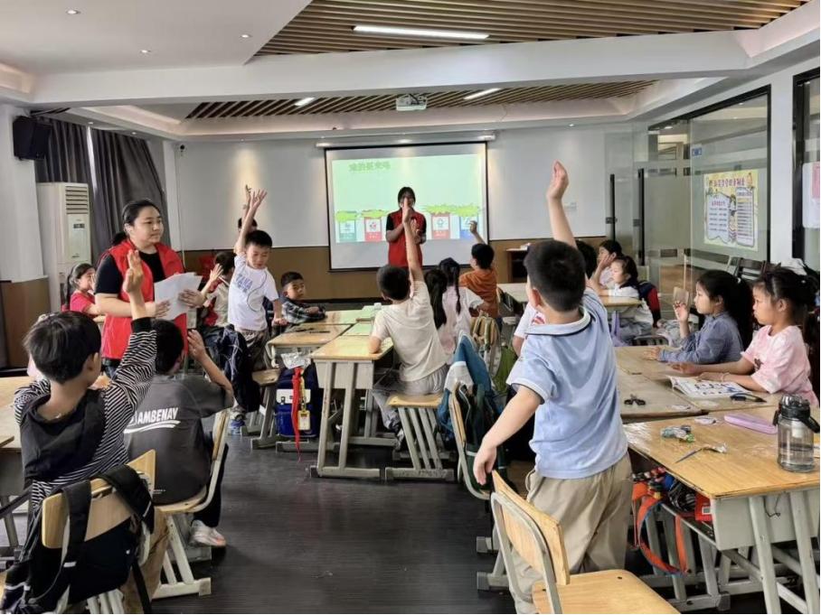 志愿者们还通过“举手抢答”环节,抛出趣味问题,引导小朋友们巩固所学知识。在互动过程中,孩子们纷纷踊跃举手,积极参与答题,不仅加深了对不同垃圾类别的认识,更在心中种下了环保的种子。