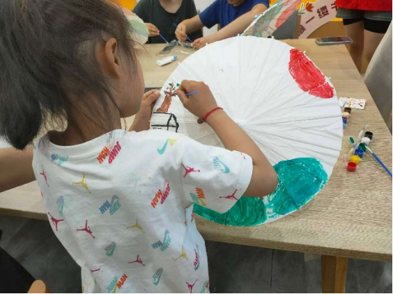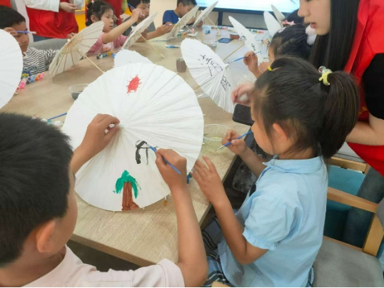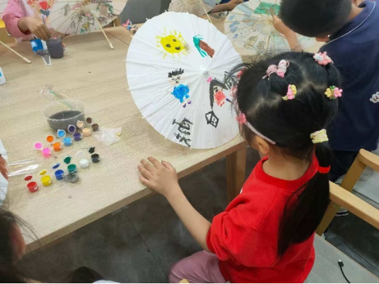 活动伊始,志愿者向孩子们介绍了油纸伞的历史渊源、制作工艺及文化寓意。作为中国传统工艺品,油纸伞不仅是遮雨工具,更承载着“圆满”“吉祥”的美好寓意。在志愿者的示范下,孩子们学习了构图、调色等手绘技巧,随后分组在空白油纸伞上自由创作。有的孩子描绘细雨润物的谷雨景象,有的则画出春燕衔泥、百花盛开的春日图景。手绘完成后,孩子们踊跃分享创作灵感,现场欢声笑语不断。