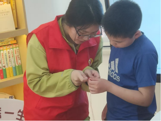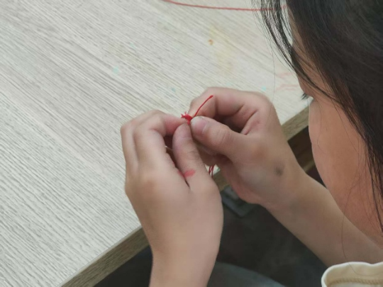 在手绳编织环节,志愿者讲解了手绳的文化内涵与编织技法,并演示平结、蛇结等传统编法。孩子们挑选五彩丝线,在志愿者指导下动手编织,将谷雨元素融入作品中。一条条寓意平安、健康的手绳在指尖诞生,孩子们佩戴成品合影留念,自豪之情溢于言表。