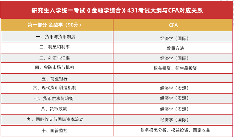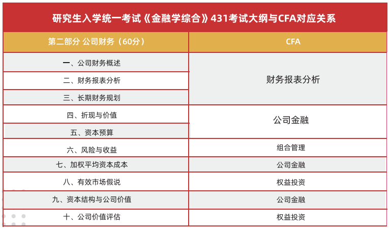 CFA培养目标和金融硕士专业学位高度重合,因此在国内各高校金融硕士专业学位的专业课考试知识点的划分上,也具有高度的一致性。