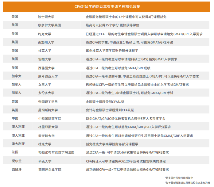 CFA证书的含金量和影响力,在申研时,会很好的体现申请人的专业能力和素养。CFA学习者将享有40+所国外院校豁免政策。
