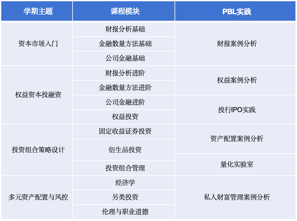 CFA人才培养项目的课程内容涵盖专业知识、实务技能、实践活动三个大板块,助力学生全方位理解并运用金融专业知识。