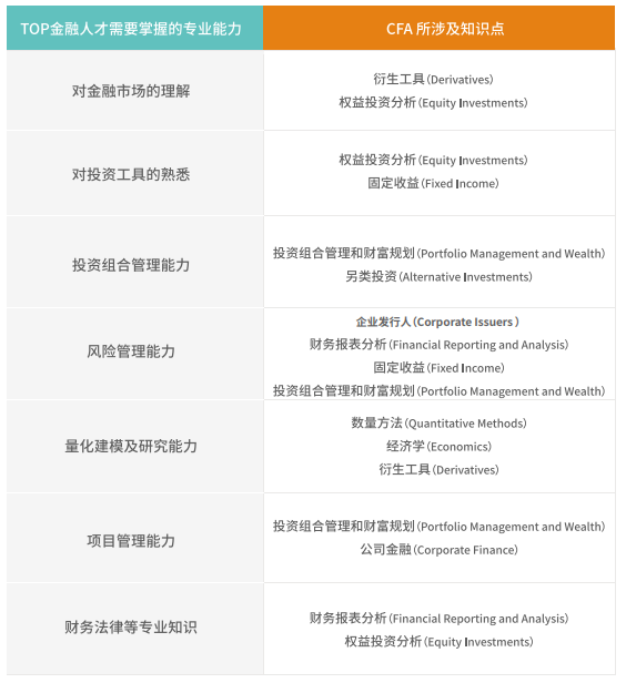 CFA的知识框架完整覆盖了金融行业各领域的专业知识,因此CFA的学习不仅可以开阔我校学子的视野,也能帮助其成为一名全面的金融人才。