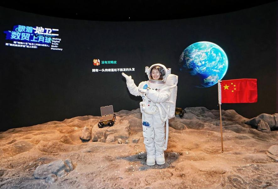 最令师生震撼的是地卫二空间技术展区呈现的“全球数贸星座2035计划”。模拟月球表面的展台上,4颗1:1比例的AI计算卫星模型与地球大屏形成呼应,工作人员介绍其可在轨实时处理光谱数据,未来还将参与“嫦娥八号”国际合作项目,实现人类首次地外天体扫码支付。