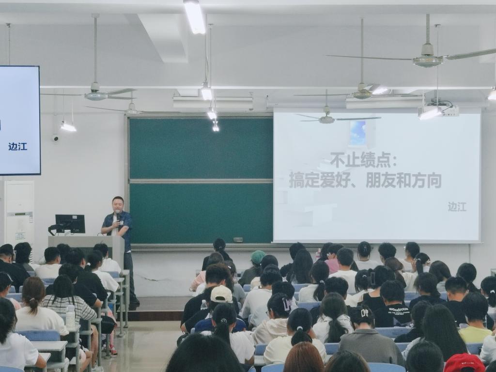 在引发思考后,边江老师结合其银行职员、作家、B站UP主等多元身份,从专业视角深入解读了大学学习的核心。他将大学的意义总结为五大能力:思维认知、实践能力、从0到1的创造力、经济头脑以及选择与取舍。这一深刻见解引导同学们跳出唯绩点论的局限,对大学的意义有了更全面、立体的理解。同时,他分享“看似一对一,实则多对多”的人生哲理,大学中每一个选择、每一段经历,都可能关联着多个成长维度,而“努力用对方向”比盲目付出更重要。