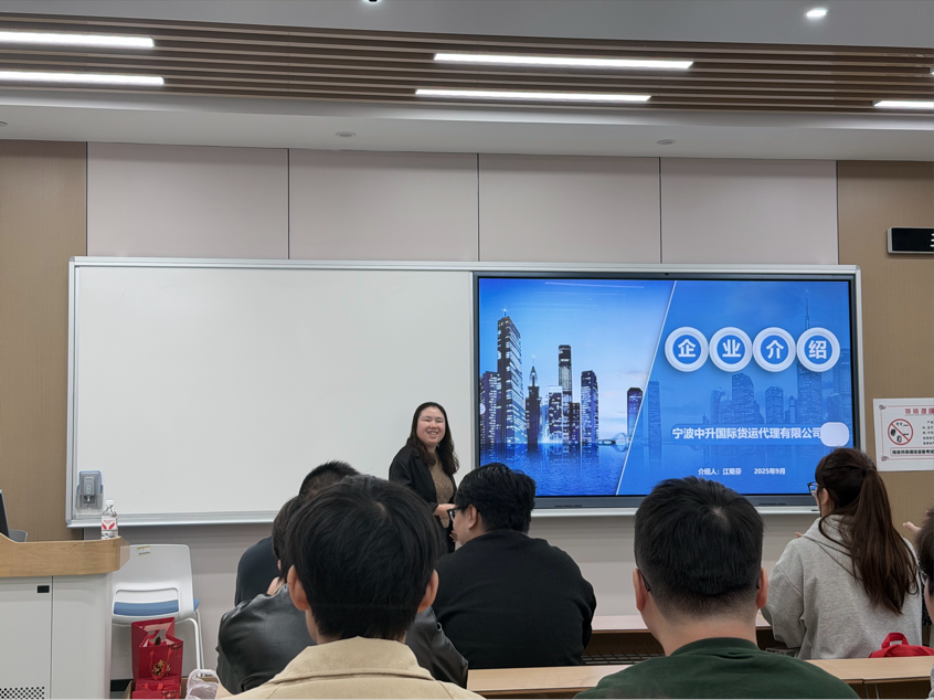 宣讲会伊始,江经理简要介绍了宁波中升国际货运代理有限公司的行业定位——作为宁波本地深耕货运代理领域的企业,其业务覆盖国际物流运输、供应链管理等核心板块,在区域内拥有稳定的客户资源与行业口碑。同时,江经理强调,本次宣讲会的核心目标是为学生搭建 “企业需求与个人就业” 的精准对接桥梁,帮助学生清晰了解岗位任职要求、薪资福利体系及职业发展空间。