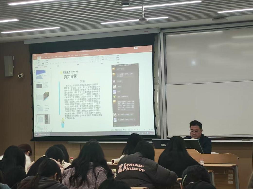 讲座伊始,吴一晨以“赌徒谬误”和“前景理论”为切入点,深入剖析投资者心理如何被不法分子利用。他通过王女士遭遇“荐股杀猪盘”的典型案例,详细还原了诈骗团伙通过建立信任、诱导投资、伪造平台、最终卷款跑路的完整链条。此外,吴一晨总结了三类常见骗局手段:包括以“免费荐股”为诱饵的分成模式、冒充正规机构的虚假交易平台、以及操纵市场的“荐股割韭菜”行为,并强调“高收益必伴高风险”的底层逻辑,提醒学生理性看待投资承诺,警惕“稳赚不赔”的谎言。