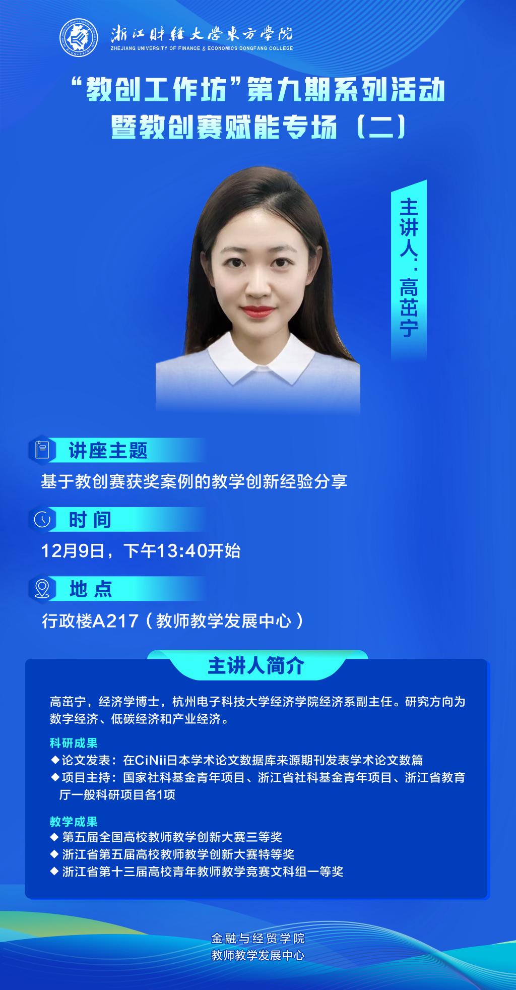 高茁宁,经济学博士,杭州电子科技大学经济学院经济系副主任。研究方向为数字经济、低碳经济和产业经济,在CiNii日本学术论文数据库来源期刊发表学术论文数篇,主持国家社科基金青年项目、浙江省社科基金青年项目、浙江省教育厅一般科研项目各1项。2025年获第五届全国高校教师教学创新大赛三等奖、浙江省第五届高校教师教学创新大赛特等奖、2023年获浙江省第十三届高校青年教师教学竞赛文科组一等奖。