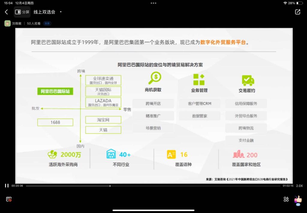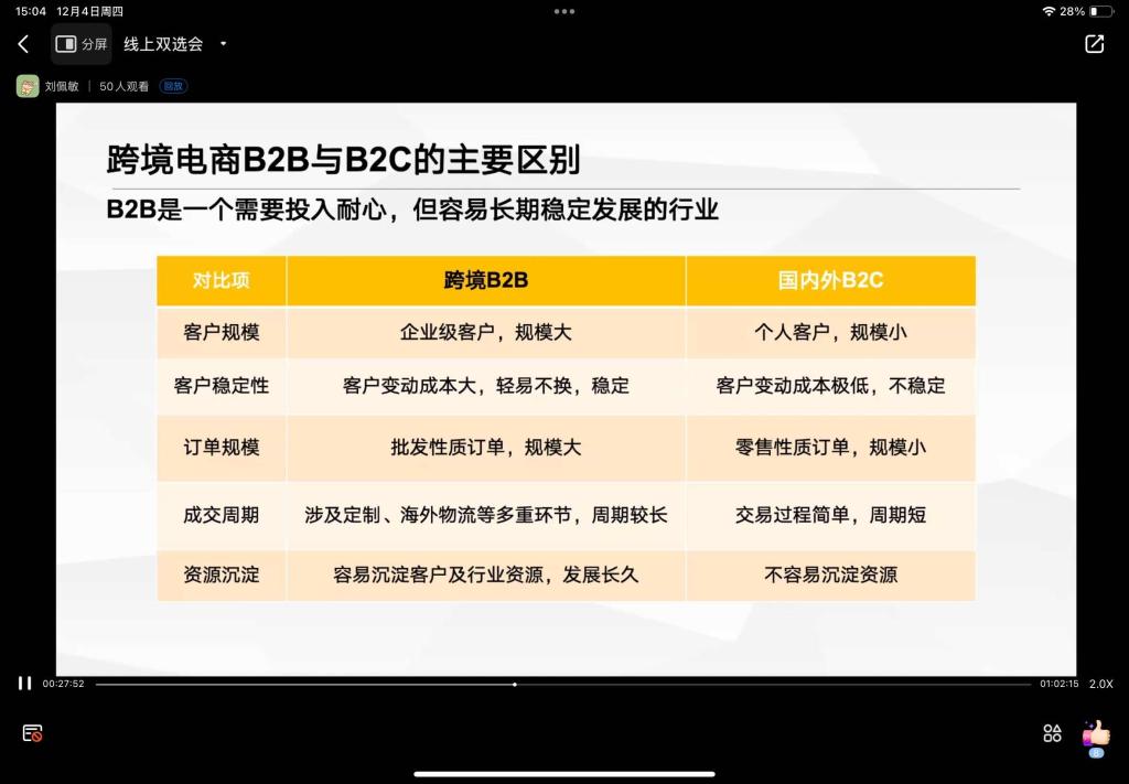活动开篇,阿里巴巴国际站方通过概念图解与数据解析,清晰梳理了跨境B2B行业的核心定位(企业对企业出口、批发类线上贸易),并对比了跨境B2B与B2C模式在客户规模、订单稳定性等方面的差异,同时介绍了阿里巴巴国际站作为数字化外贸服务平台的资源优势——覆盖200+国家和地区、服务2000万活跃海外采购商,帮助学子建立对跨境电商赛道的系统认知。