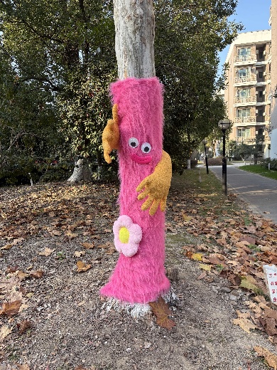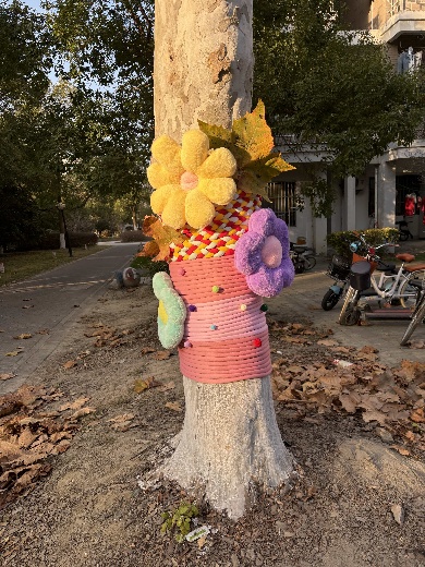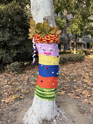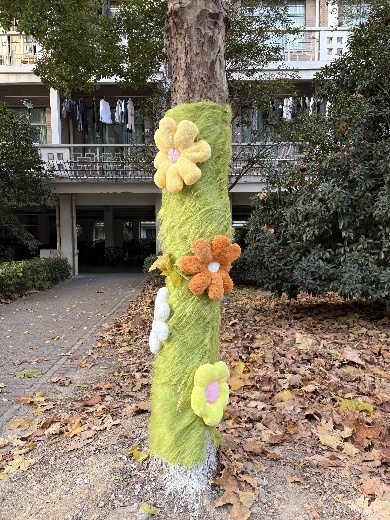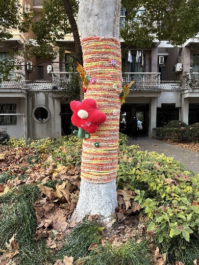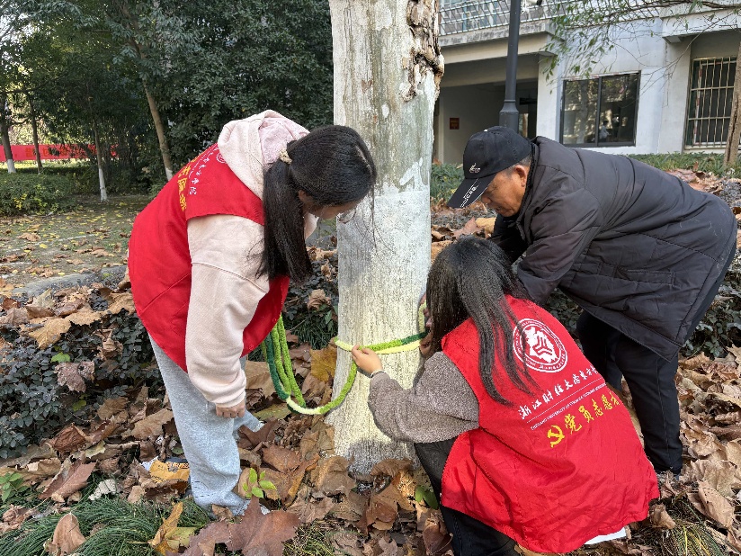 实践过程中,学生党员与入党积极分子充分展现严谨细致的专业素养。先是仔细测量每棵树的树干周长,对照尺寸裁剪保温棉,避免材料浪费,然后遵循“交叉编织+紧密包裹”的工艺实践,当遇到接口松动问题时,大家灵活运用“线绳锁边+胶水固定”技巧,反复校准调整,确保防寒衣既保暖防风,又不损伤树皮。指尖翻飞间,原本裸露的树干陆续换上整齐美观的“暖冬防护衣”,成为冬日校园里的一道独特风景线。