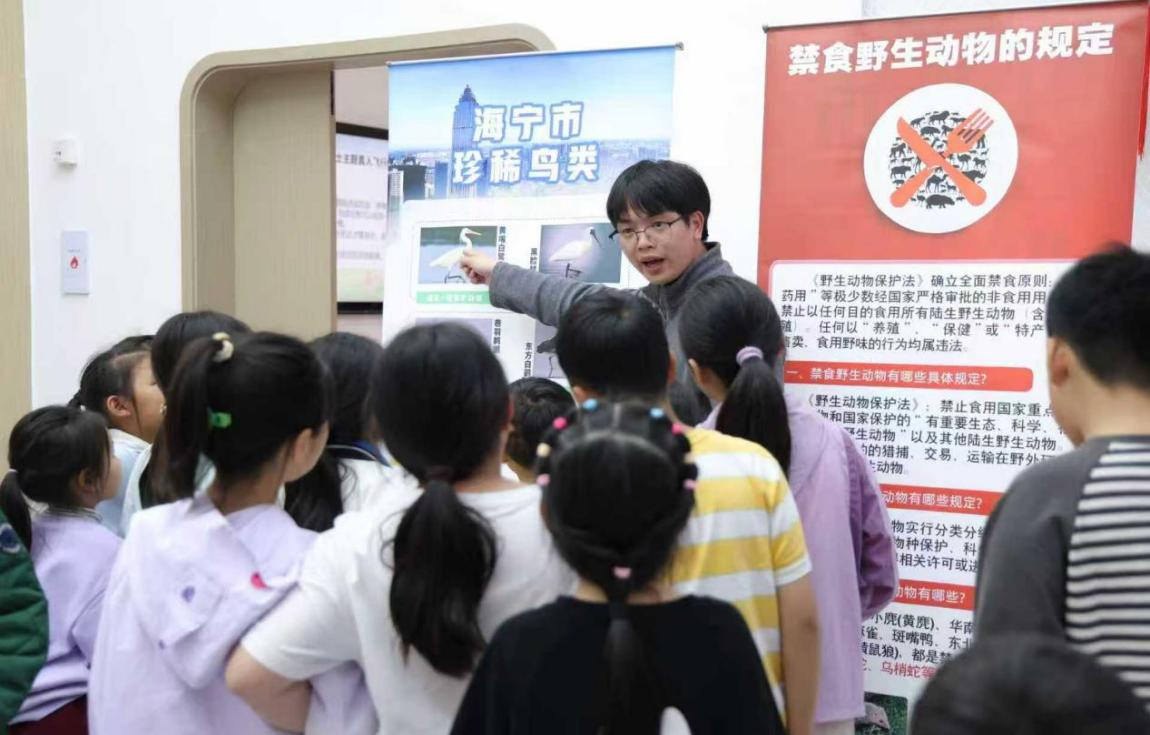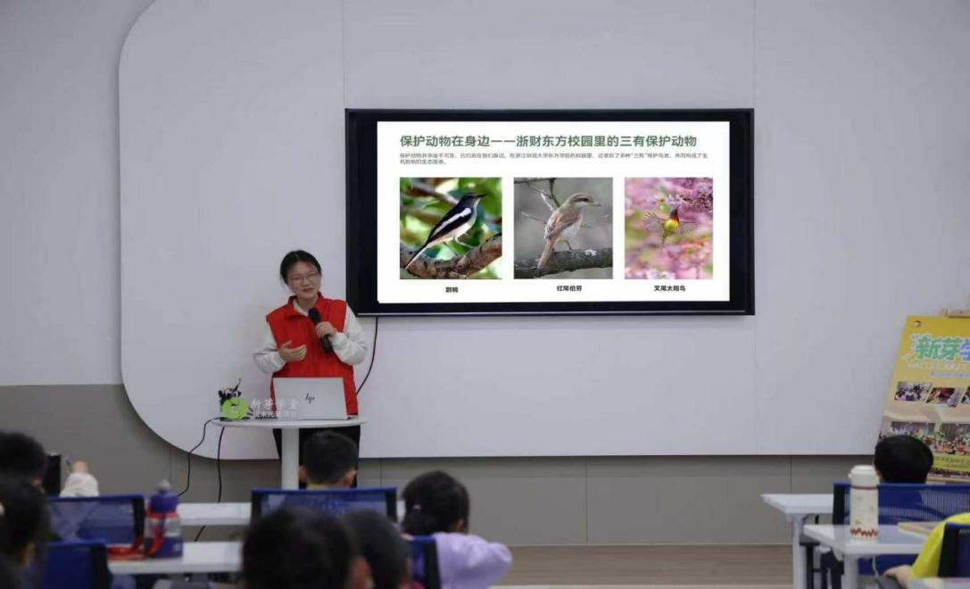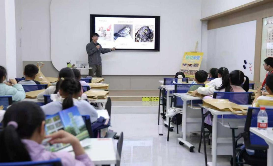 海宁市自然资源和规划局沈星宇分享了海宁市陆生野生保护动物救助站的暖心故事。小学生们目不转睛地观看红隼、灰脸鵟鹰、红角鸮、白鹇、仙八色鸫等国家二级保护动物的救助影像,连连发出惊叹。小松鼠 “松松” 的救护日记让他们真切地感受到生命守护的温暖,更加用心地学习科学参与救护。