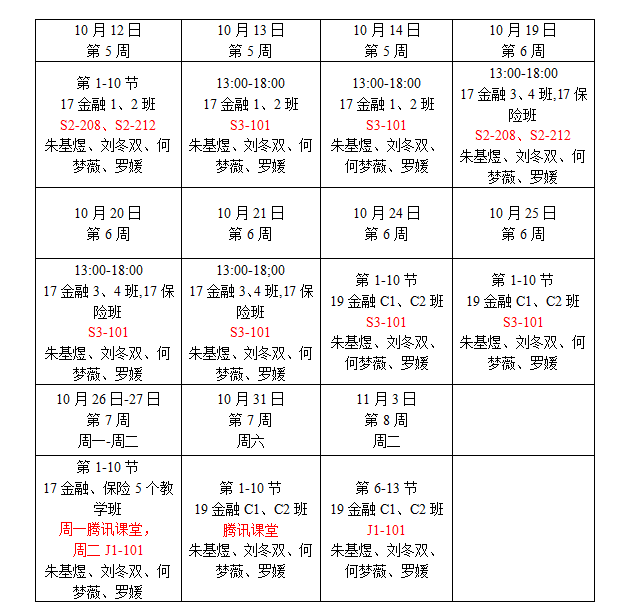 2017级金融学专业、2017级保险学专业、2019级金融学专业(专升本),综合实训2共3学分,50课时,教学内容为证券量化分析(含数据收集与处理)和金融产品设计,计划分两个阶段进行。第一阶段分成3个教学班,每周3天上机实训,时间安排从校历第五周开始。第二阶段7个行政班集体上课,时间安排在第九周(11月9号与10号),线上1天,线下1天。教学具体安排如下: