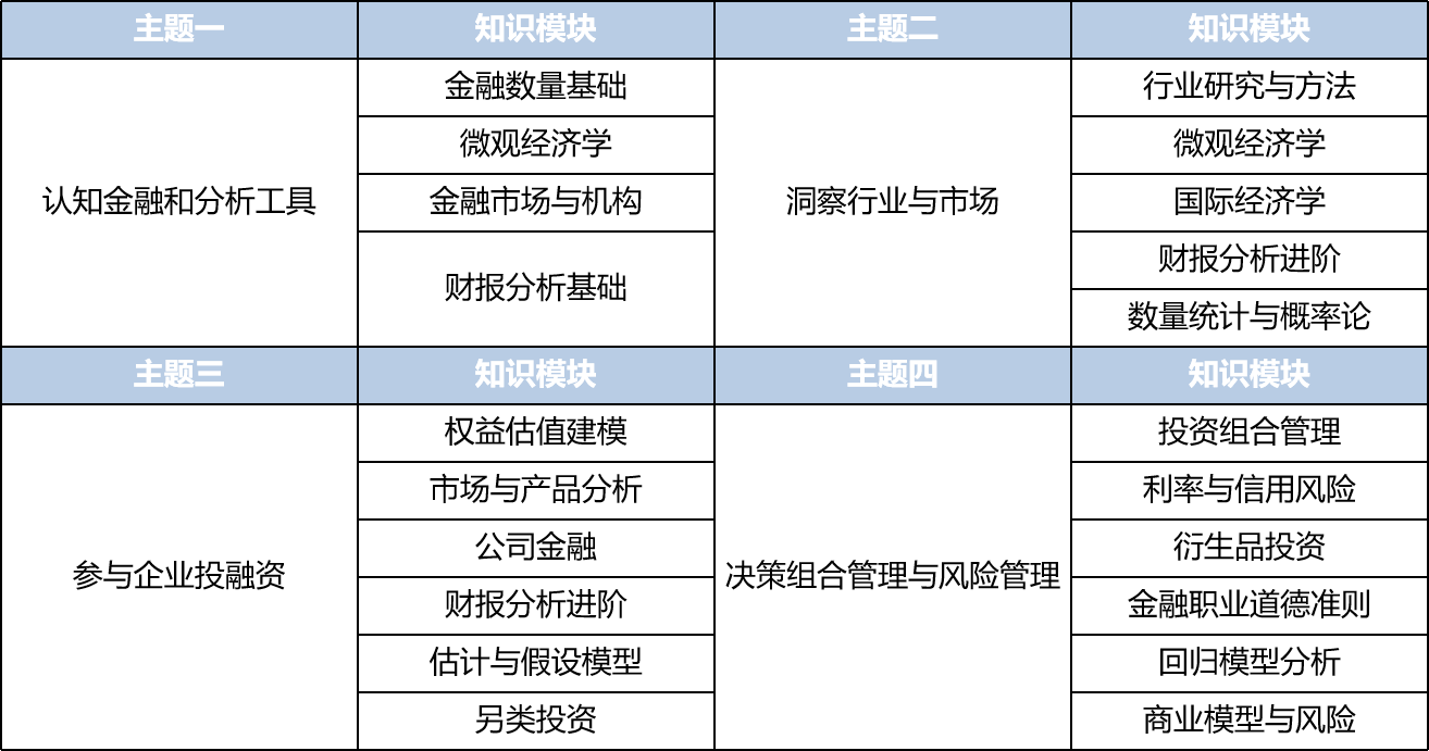 CFA人才培养项目的课程内容涵盖专业知识、实务技能、实践活动三个大板块,助力学生全方位理解并运用金融专业知识。