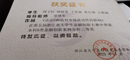 2020年12月,由浙江省大学生科技竞赛委员会、钱塘江金融港湾高等教育联盟联合主办的“杭州银行杯”第五届浙江省大学生金融创新大赛正式落下帷幕,我院金融学专业2017级同学缪子轩及其带领的团队从全省诸多同学中脱颖而出,取得了省级三等奖的好成绩。