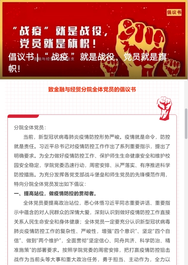 随着疫情的发展,伟德BV1946金融与经贸分院第一时间成立以院长、书记为组长的疫情防控工作组。制定了疫情防控工作方案、教学工作预案等,压实细化责任,具体落实到人。学院各党支部充分利用微信群、“学习强国”学习平台,开展“众志成城,共抗疫情”线上主题党日活动,通过“寻找抗疫微故事”“战疫必胜”“武汉加油”等活动,号召学生党员做好个人防疫,合理安排假期生活。