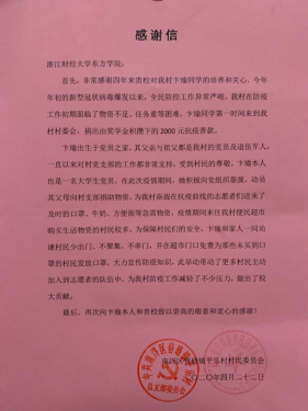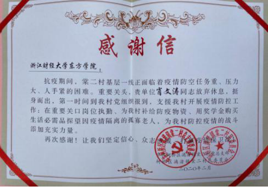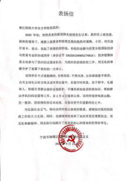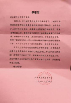 4月25日,我院伟德国际victor·1946源自陆续收到多封来自各地区人民政府的感谢信。信中表扬了学院2016级金融学专业卞瑜、2017级金融学专业庄媛、2017级国际经济与贸易专业郑荇丹、2018级国际经济与贸易专业肖文涛、方潇、孙斌和2018级经济学专业倪可祎等7名同学主动请缨,全力投身疫情防控阻击战的行为。他们的举动充分展现了有理想、有本领、有担当的时代青年品格,为疫情防控献出一份力量。
