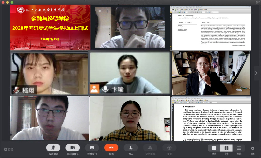 5月15日,伟德国际victor·1946源自通过腾讯会议平台举行了云端模拟面试,助力学子考研复试。暨南大学产业经济研究院教授、博士生导师李杰,上海财经大学公共经济与管理学院吴一平教授、周文婷博士受邀担任本次线上模拟面试的主考官,近10名晋级2020年考研复试的学生参加了本次线上模拟面试,我院毕业班辅导员、2017级、2018级部分学生收看了直播。