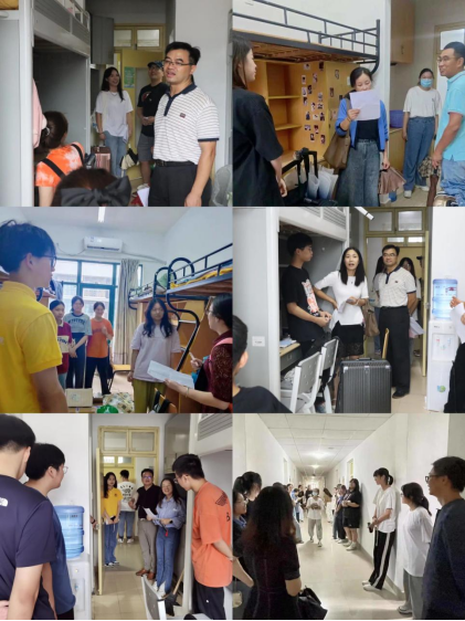 学院领导、各系主任、新生专业导师、新生辅导员以及新生班助走访新生宿舍,亲切的与新生交谈,谈及他们的宿舍生活,给予关怀,帮助他们更好的适应新环境新生活。