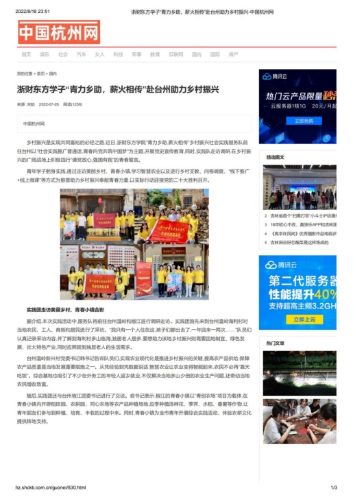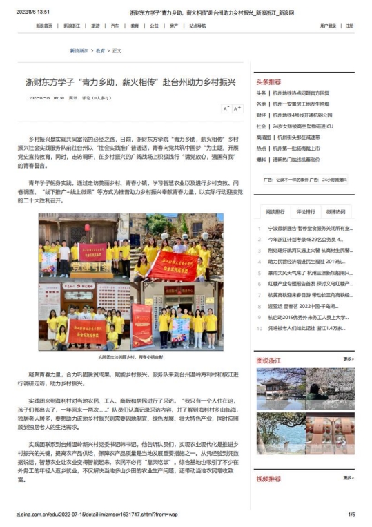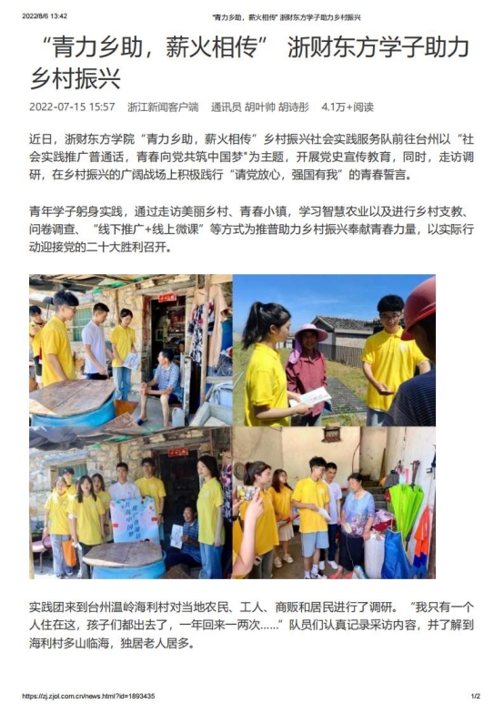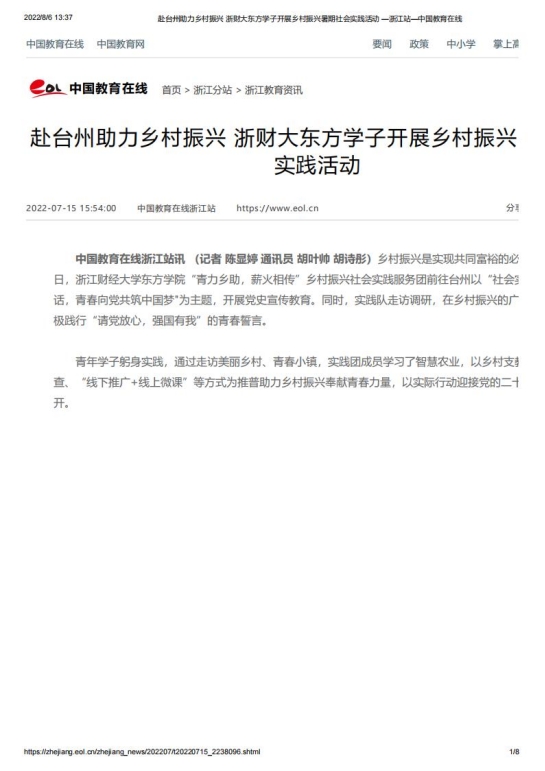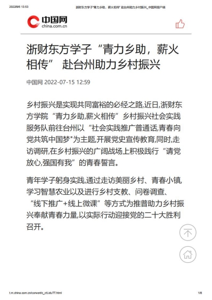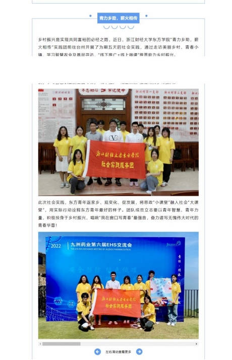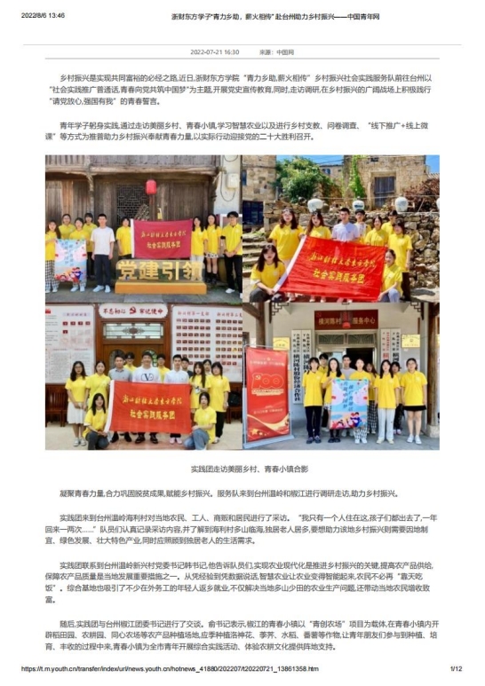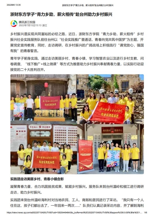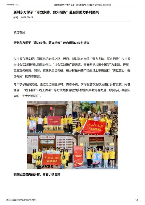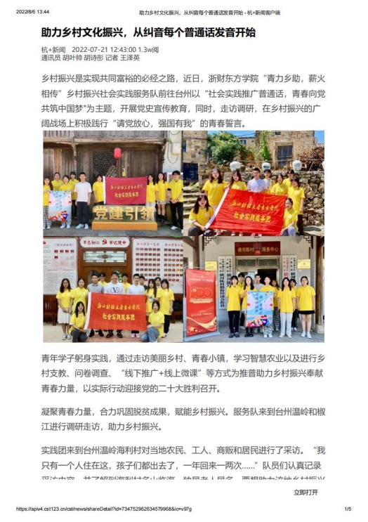 我院赴台州“青力乡助,薪火相传”推普助力乡村振兴实践团队在指导老师胡叶帅的帮助与启发下,成功入选2022年“推普助力乡村振兴”全国大中专学生暑期社会实践志愿服务活动。团队以“社会实践推广普通话,青春向党共筑中国梦”为主题,在开展走访调研中,积极践行“请党放心,强国有我”的青春誓言。青年学子躬身实践,通过走访美丽乡村、青春小镇、智慧农业、乡村支教、问卷调查、“线下推广+线上微课”等形式为推普助力乡村振兴奉献青春力量,以实际行动迎接党的二十大胜利召开,受到了中国网、中国教育在线、中国青年网、中国大学生网、新浪浙江网、杭州日报、杭州网等多家媒体关注报道。