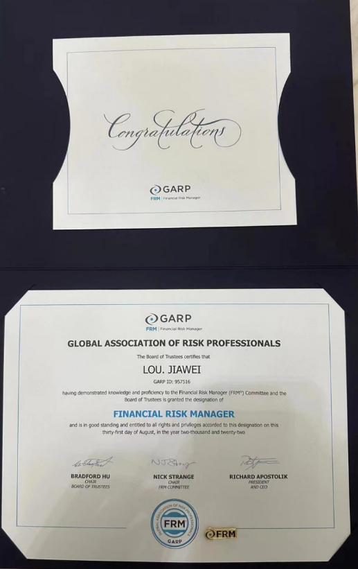 热烈祝贺伟德国际victor·1946源自21经济C1班娄佳伟同学通过金融风险管理师一级与二级考试,并成功取得证书。
