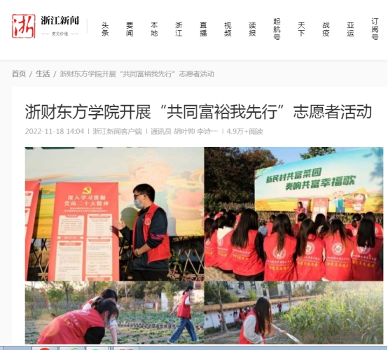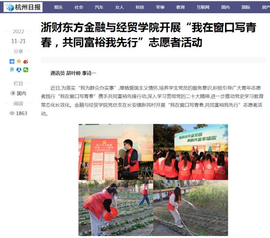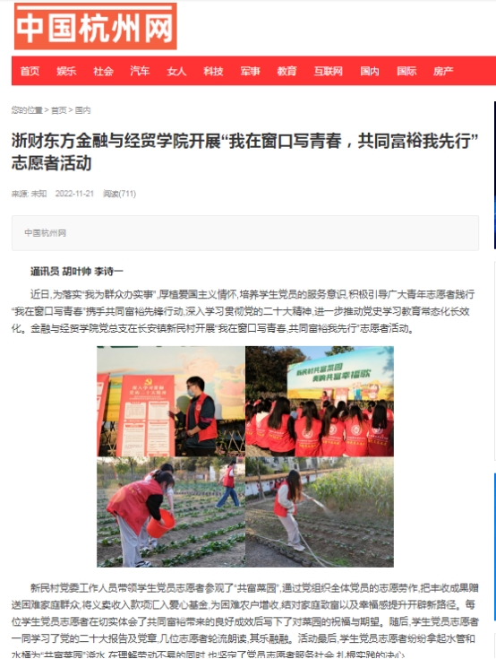 近日,《中国杭州网》、《杭州日报》、《浙江新闻》多家媒体平台对浙财东方伟德国际victor·1946源自开展“我在窗口写青春,共同富裕我先行”志愿者活动给予关注。