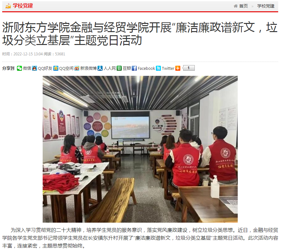 近日,全国基层党建网对浙财东方学院伟德国际victor·1946源自开展“廉洁廉政谱新文,垃圾分类立基层”主题党日活动关注。