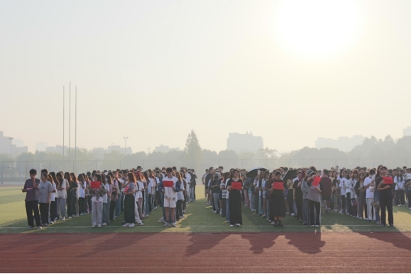伴随着庄严的《义勇军进行曲》,五星红旗冉冉升起,迎风飘扬。在场的每一个人向国旗行注目礼,深怀对祖国无限的热爱和崇高的敬意。