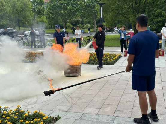 该疏散演练按活动预案有条不紊地进行,参与活动的师生从图书馆中迅速撤离,用时符合要求,整个演练过程紧凑有序。疏散至图书馆前小广场后,海宁消防队指导员陆建城向师生讲解并演示了灭火器的使用方法,随后指导师生实操灭火器。