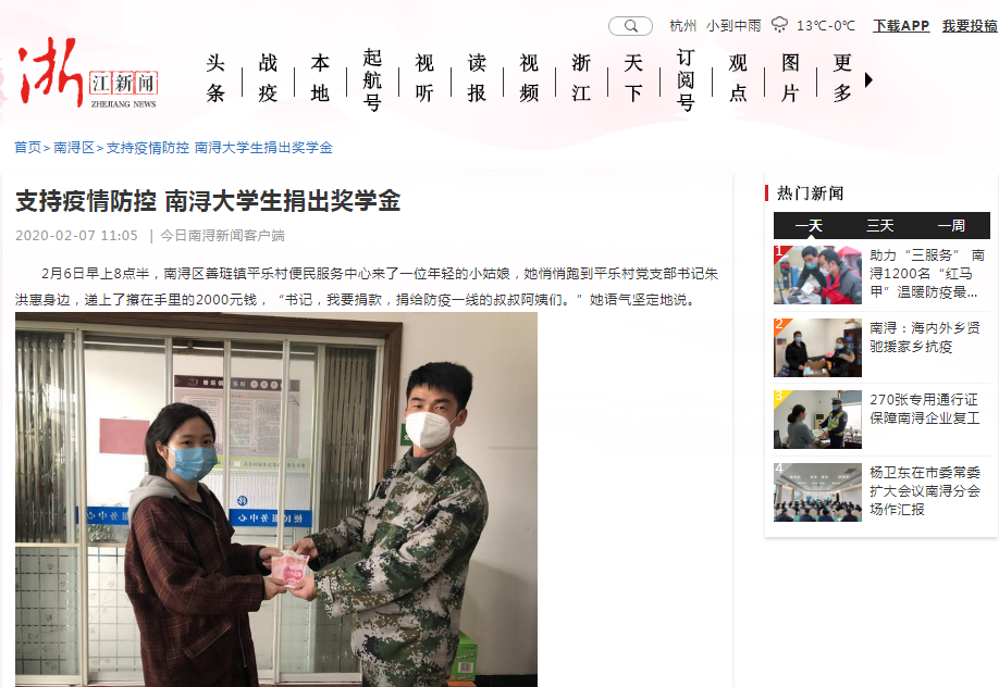 2月6日早上8点半,南浔区善琏镇平乐村便民服务中心来了一位年轻的小姑娘,她悄悄跑到平乐村党支部书记朱洪惠身边,递上了攥在手里的2000元钱,“书记,我要捐款,捐给防疫一线的叔叔阿姨们。”她语气坚定地说。