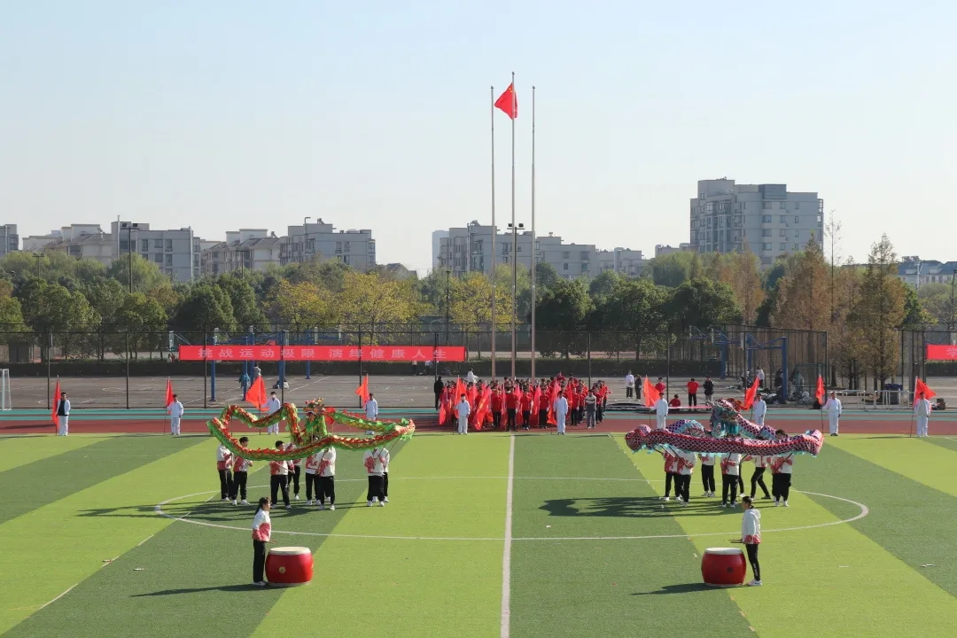 伴随着慷慨激昂的运动员进行曲,威武雄壮的国旗护卫队、热情洋溢的鲜花队、意气风发的红旗队闪亮出场。随后,跆拳道百人表演、街舞队表演、八大学院开幕式集体表演依次登场,展现东方学子积极向上、拼搏奋进的风采和精神。伟德国际victor·1946源自带来的《龙游东方 青年自强》百人方阵表演荣获第一名。