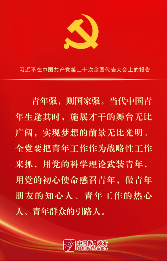 青春逢盛会,奋进新征程。习近平总书记多次指出,青年一代有理想,有担当,国家就有前途,民族就有希望。青年是社会力量中最富有生机活力的群体。作为一名青年学生干部,在今后工作中,我将坚定理想信念,不忘初心,牢记使命,锤炼本领,尽职履责,充分发挥基层团组织的独特优势,主动帮助广大学生扣好人生第一粒纽扣,引领广大青年健康成长,全面发展。