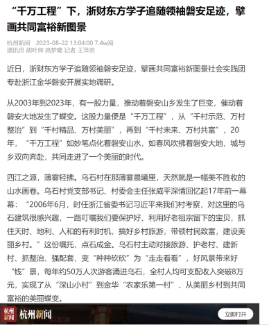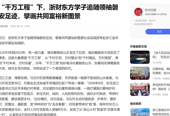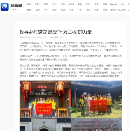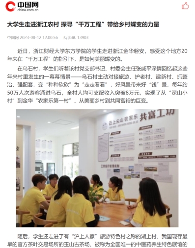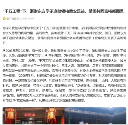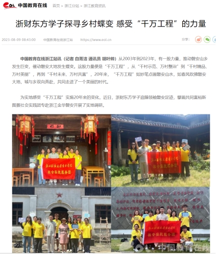 我院赴金华磐安“追随领袖磐安足迹,擘画共同富裕“新图景”社会实践服务团赴在指导老师胡叶帅的帮助与启发下,顺利开展大学生“三下乡”暑期社会实践活动。团队以学习磐安县如何根据习近平总书记的指导坚持一张蓝图绘到底为主要目标,在开展走访调研中,追随领袖足迹,擘画共同富裕新图景。青年学子跨越山水赴磐安,通过实地调研乌石村、玉山古茶场、湖上村、江南药镇养生博览馆,深刻感悟习近平新时代中国特色社会主义思想的真理力量、实践伟力,实地感受“千万工程”实施20年来的变化,实践成果受到了中国网、中国教育在线、中国青年日报、杭州新闻、杭州日报、杭州网、全网基层党建网等多家媒体关注报道。