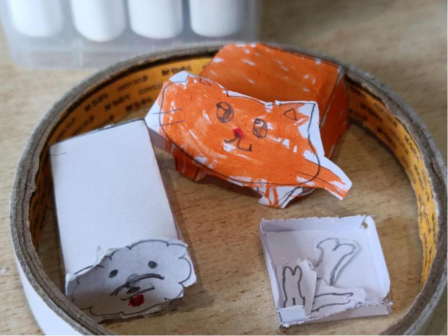 孩子们的积极性高涨,动手能力极强。他们发挥想象力,为小狗穿上独特的“衣服”,打造别具一格的“发型”。在裁剪中遇到困难时,他们主动寻求帮助,相互协作,共同解决问题。形态各异的纸壳小狗在孩子们手中诞生,他们的自豪与喜悦溢于言表,纷纷展示自己的作品,分享这份独特的成果。