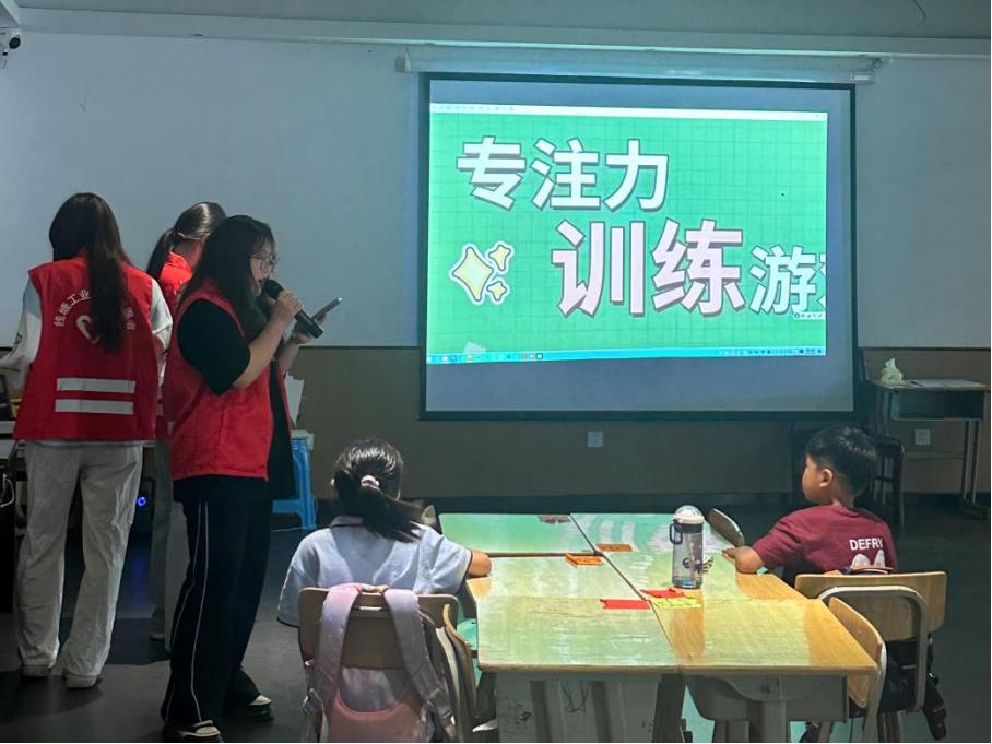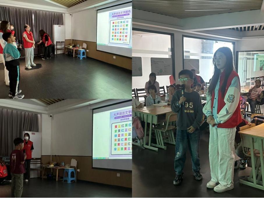 了解完端午节的文化习俗后,志愿者带领小朋友们参与专注力趣味小游戏。在小朋友们期待的眼光注视下,志愿者向小朋友们解释游戏的规则,不受文字干扰,讲出字体的颜色即为胜利。看起来简单,答起来可一点都不简单,小朋友们争相举手挑战,站在屏幕前的他们眉头紧锁,大脑飞速运转,但是有人惜败有人一次通关。志愿者鼓励小朋友们测在平时可以多多通过游戏的方式提高自己的专注力,下一次一定会完成地更好。