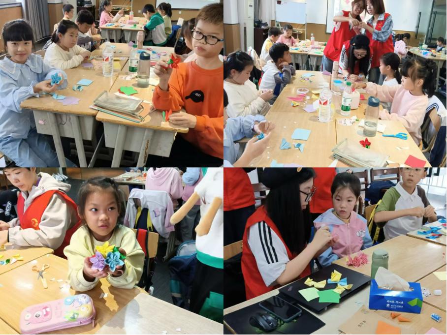 在游戏环节,志愿者们巧妙地将绣花球的魅力融入折纸艺术之中。孩子们人手一份色彩斑斓的折纸,在志愿者的细心指导下,专注地折叠出一个个绣花球的轮廓。每一次折痕的形成,都是对自然世界的一次探索和热爱。志愿者们适时地解读每种颜色绣花球背后的花语,既拓宽了孩子们的认知,也点燃了他们探索大自然奥秘热情和渴望。