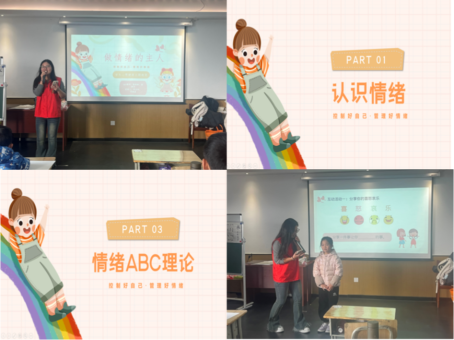 课程拉开序幕,志愿者们运用生动的故事巧妙地揭开了情绪的神秘面纱。情绪,如同心灵画卷上的“艺术家”,以其斑斓的色彩勾勒出我们的内心体验。他们向孩子们展示了情绪的两大阵营——积极与消极,以及它的四重奏——喜、怒、哀、乐。志愿者们还讲解了情绪的ABC理论,引导孩子们认识不同的视角如何塑造情绪的体验。经过这次学习,孩子们对情绪的理解焕然一新,学会了如何情绪管理,以乐观的心态迎接生活的每一个挑战。
