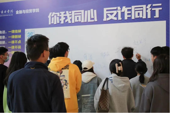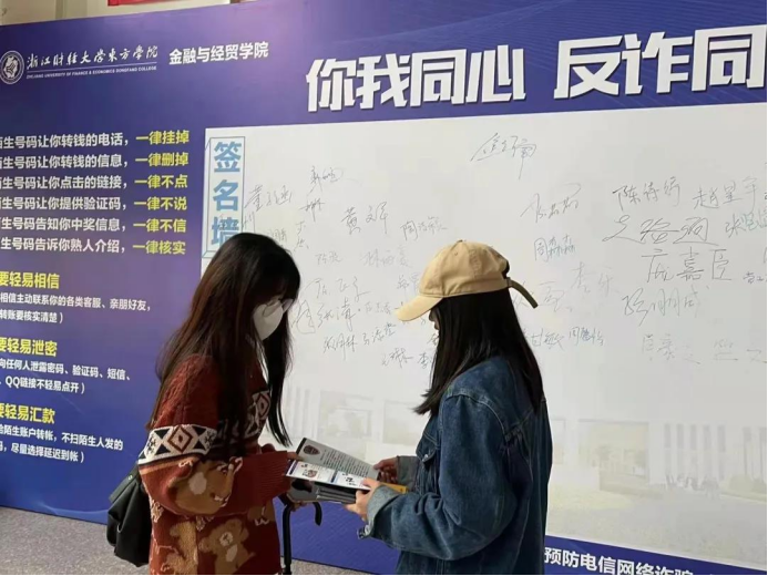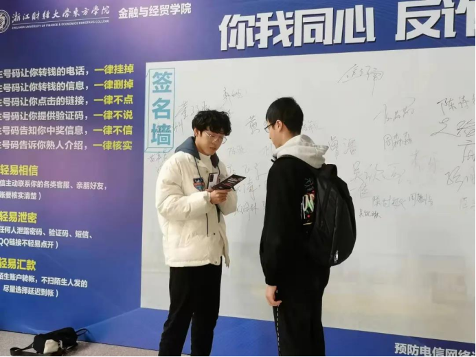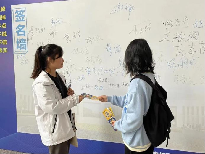 学生党员和青年团员向路过同学发放反诈骗宣传册,提醒同学们在日常生活中要多看诈骗案例,掌握防骗技巧,谨防被骗。路过的同学们纷纷被吸引并驻足学习,积极在签名墙上签名。